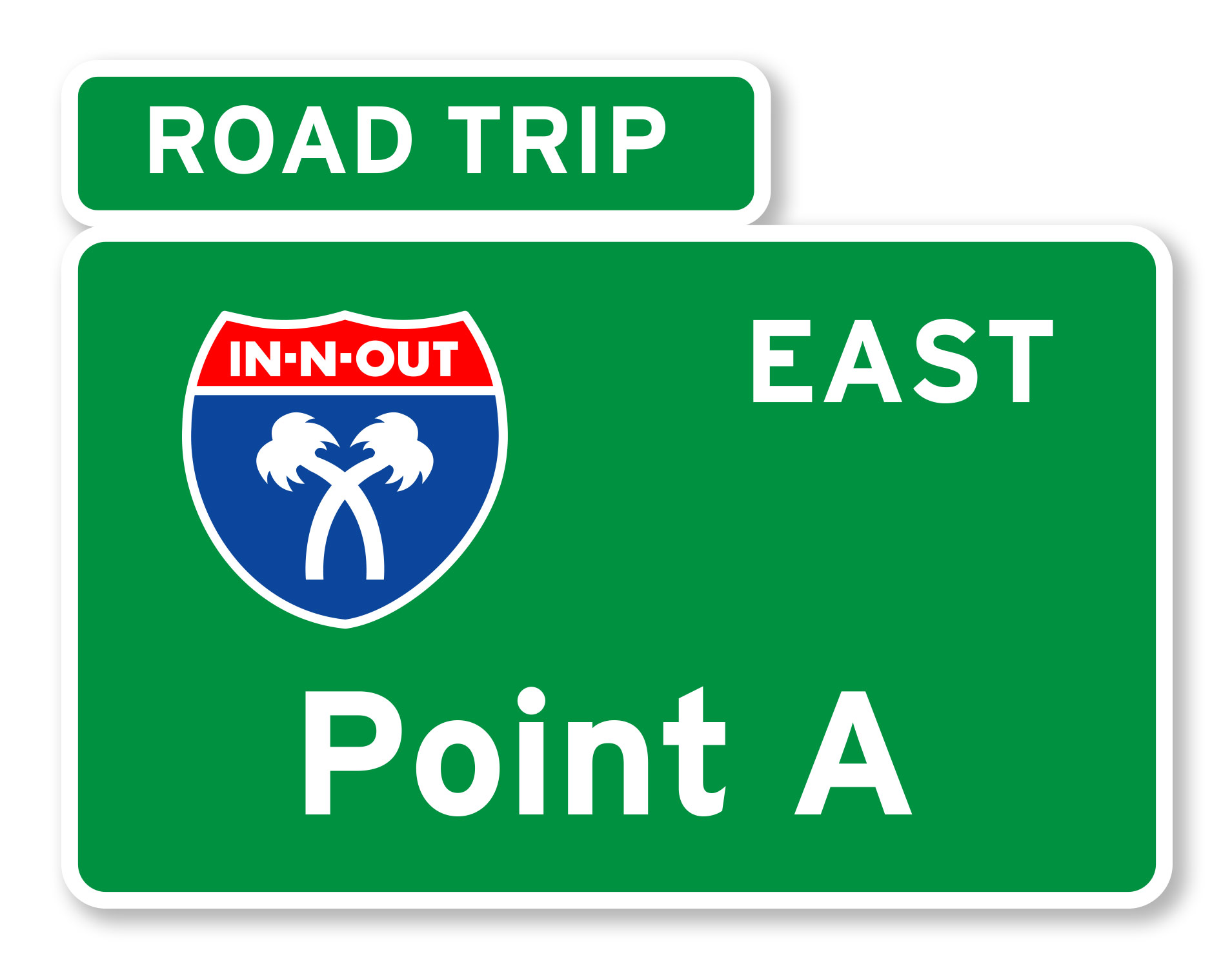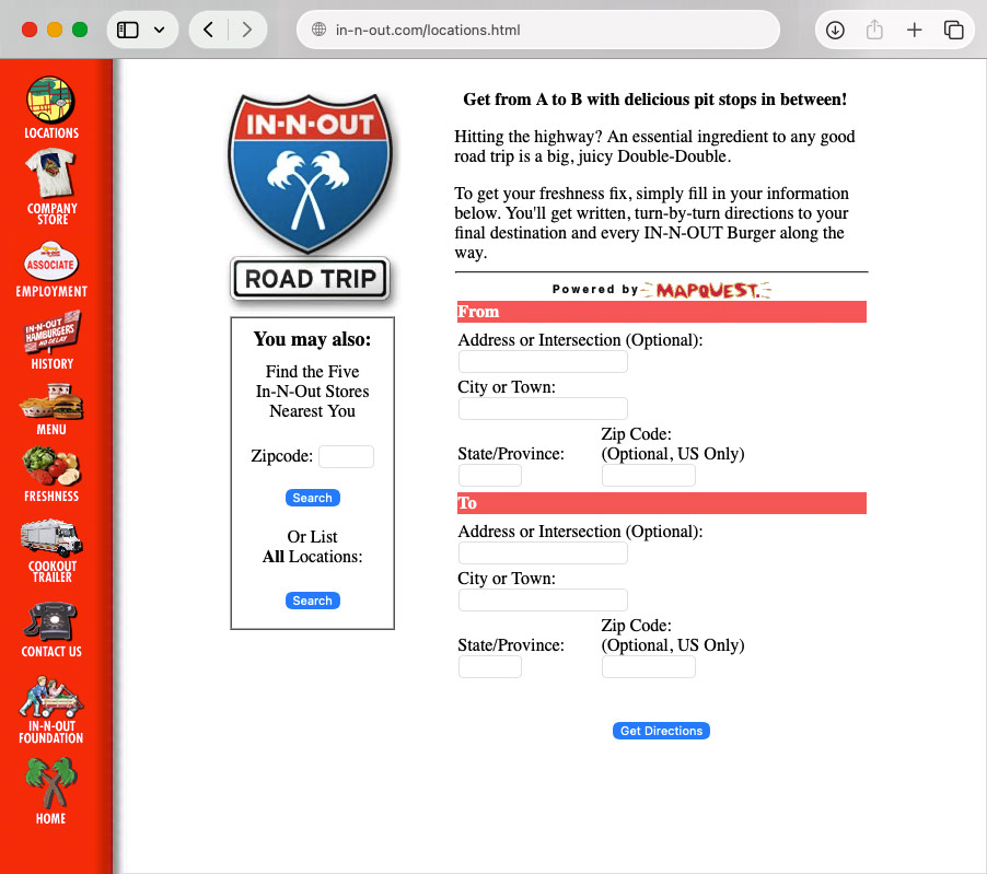 In-N-Out Burger was in the process of reworking their website and, at the time, didn’t have functionality for showing the different In-N-Out locations. In the process of brainstorming the project, the idea to create a concept that was more than just a set of points on a map, a “road trip” came up and was a unique implementation for the location finder. The web page would allow a user to do a generic search or put in a starting and ending point and the site would give driving directions and indicate all of the In-N-Out locations along the way. I was given the responsibility to come up with a logo for this new section of the website and played around with several ideas until I decided upon a take on street signs. Ultimately the Interstate sign version of the logo was pitched and it was used on the website and in various other places on In-N-Out advertising (like their printed version of the location list) for the better part of 15 years.