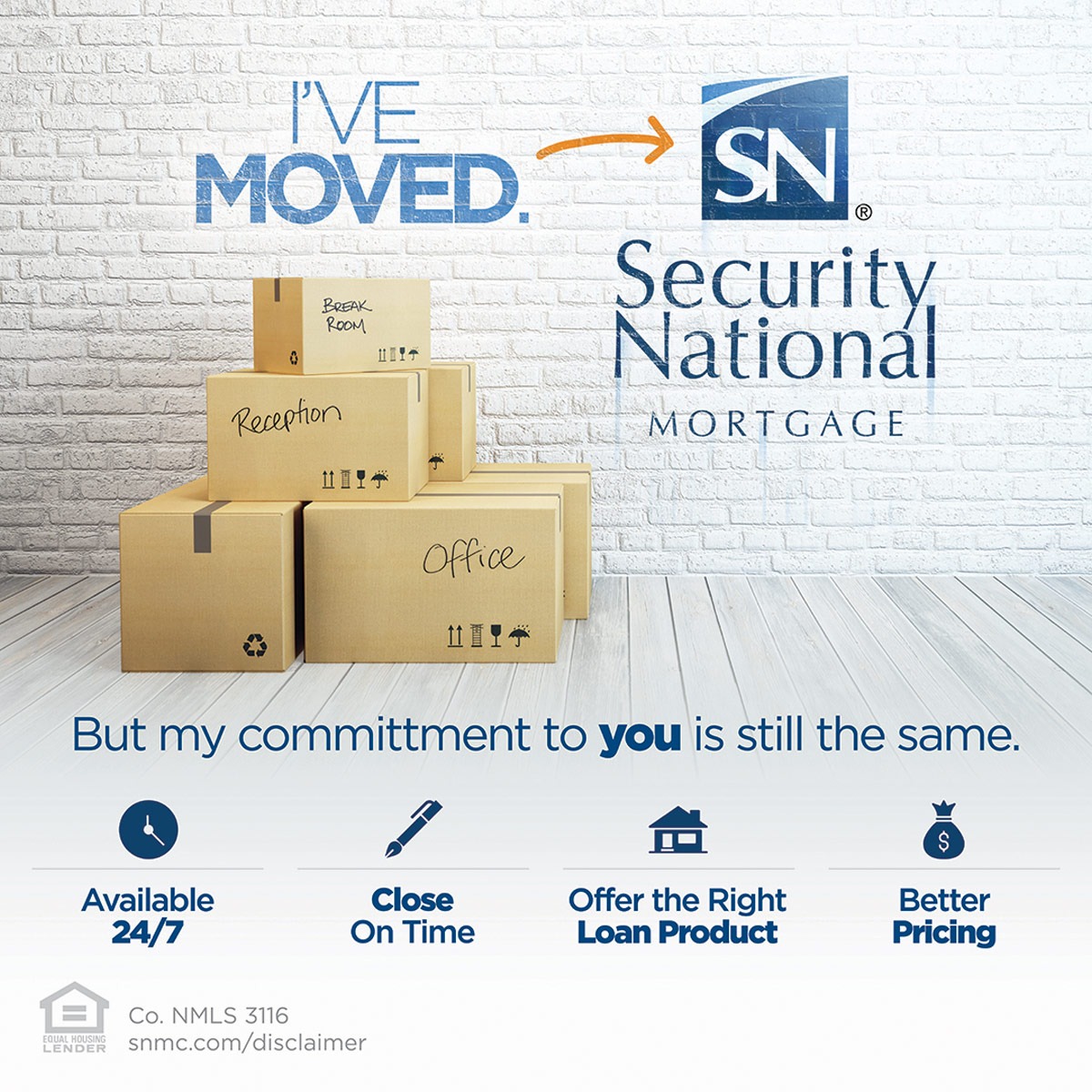 Whenever a new Loan Officer started at SecurityNational, one of the things the company made sure to provide was marketing items to help the LO announce their new home. One of the main pieces was the set of "I've Moved" items – social media, postcards, and flyers. The social piece was designed to be used on Twitter, Facebook, Instagram, and LinkedIn. I used a piece of stock photography, added the text and logo to the brick wall, and hand-lettered the writing on the moving boxes.