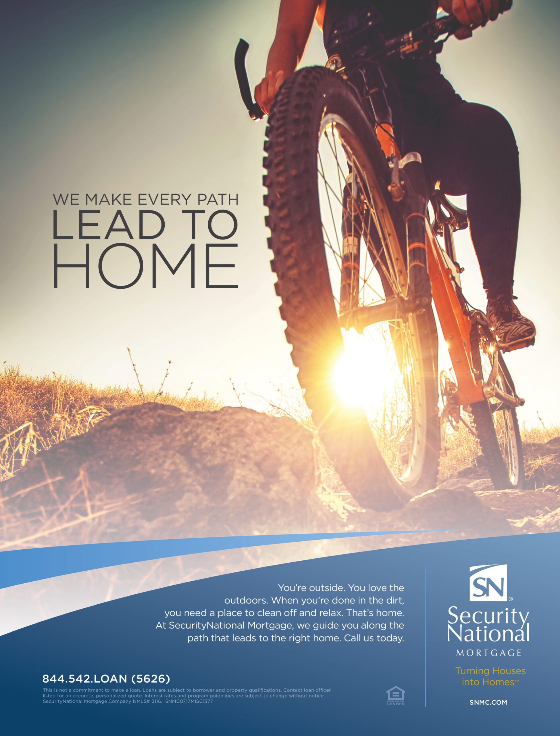 The first Sports Guide ad I created for SecurityNational Mortgage was one for a late summer issue. I developed concepts for several ideas – biking, hiking, and running, to name a few – but I decided to go with a mountain biking theme, writing the headline "We Make Every Path Lead To Home," with the idea of "no matter what path you're on, we can make it lead to your new home."