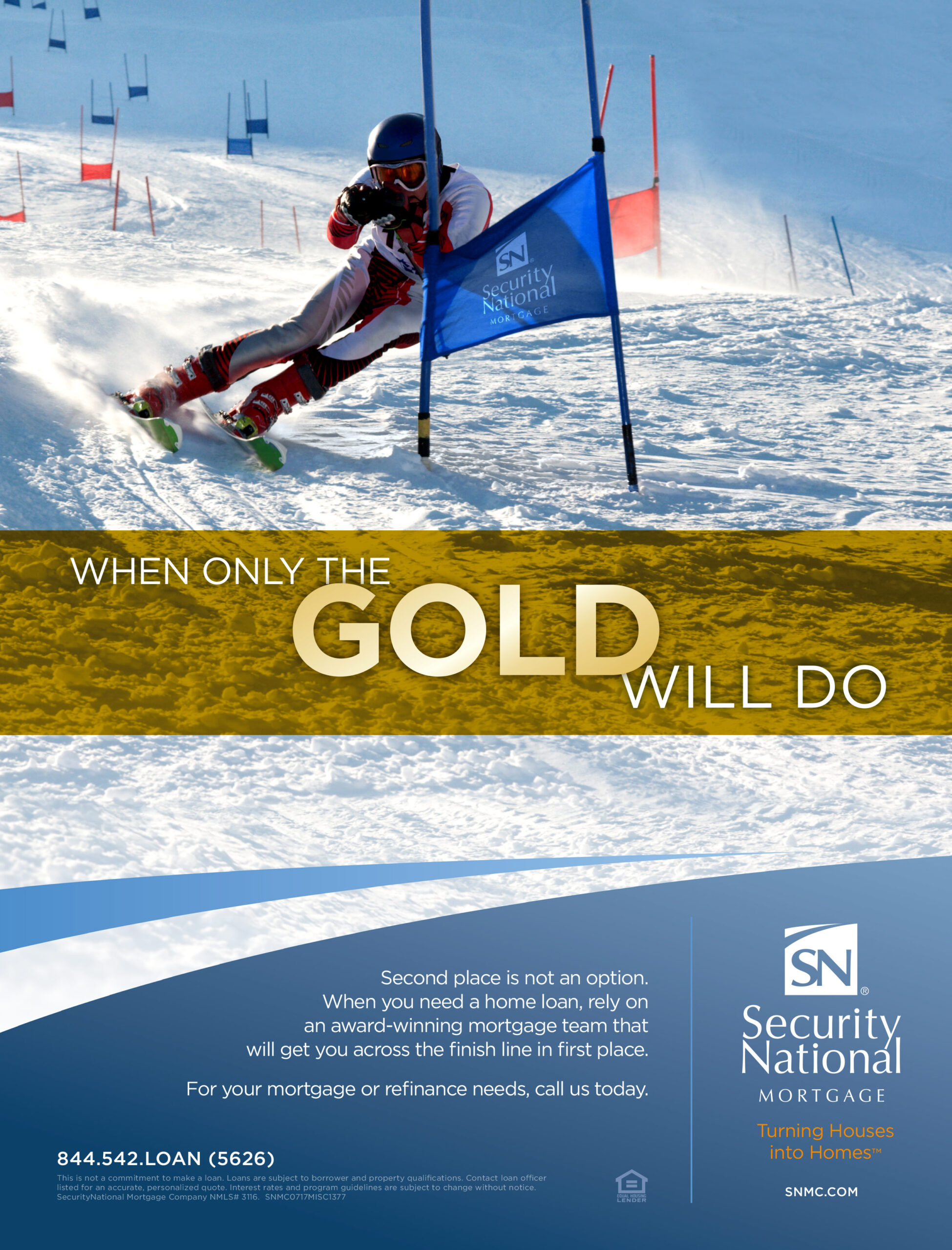 No Silver medals here! For the ad leading up to the beginning of the PyeongChang 2018 Olympic Winter Games, I decided to go with a "Go for the Gold!" concept, using a photo of a downhill skier and adding the SecurityNational Mortgage logo on the gate the skier is going around, with the headline, "When Only the GOLD Will Do," pointing to SecurityNational's many years of award-winning service.