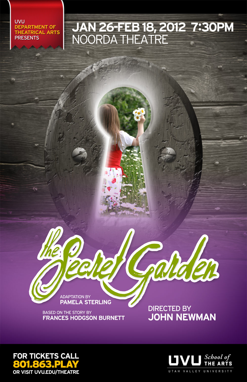 The poster design for one of the first of the children's plays for the 2011-2012 theatre season was for The Secret Garden. After brainstorming with the director for the play, I developed the logo design and decided to use the keyhole in the garden's hidden door as the main visual for the poster, using a concept where the outside world was dreary and lacked color, and the garden's world was in vibrant color. I used a stock photo for the girl inside the garden and another of old wood for the door, then created the keyhole in Photoshop and Illustrator.