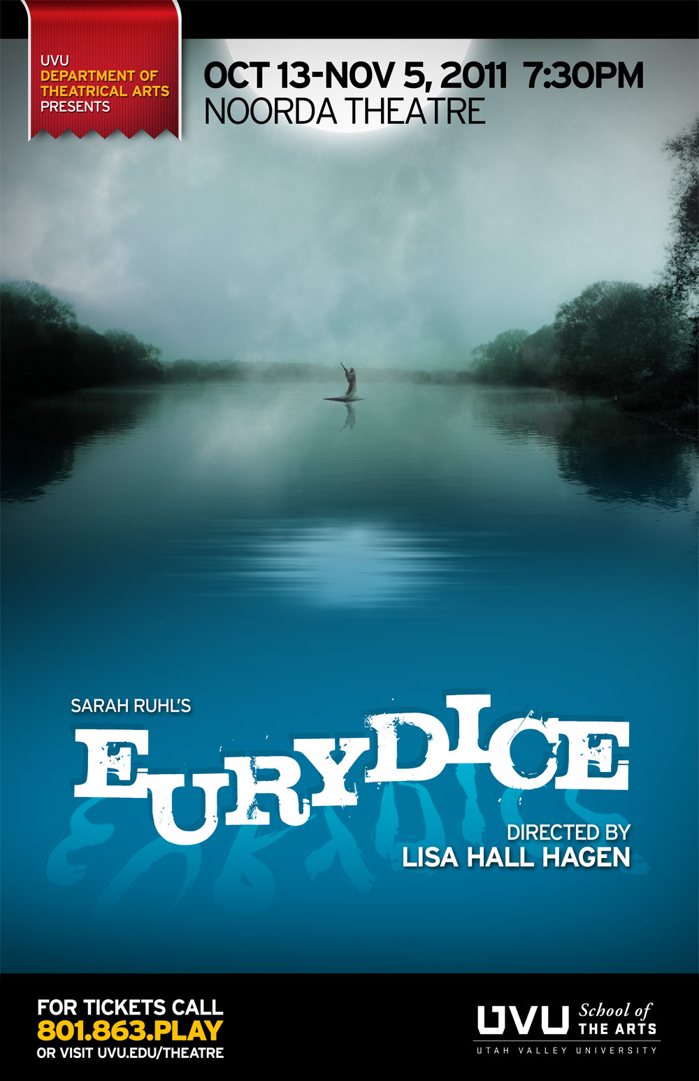 The story of Orpheus and Eurydice, the tragic Greek lovers, follows Orpheus on his quest to retrieve Eurydice from the Underworld. The poster design features the lone Orpheus traveling across a river in the moonlight, heading toward the Underworld. The logo design incorporated a bit of word play, portraying the steps between the letters "U" and "I", or you and I, the path between Eurydice in the Underworld and Orpheus on the surface.