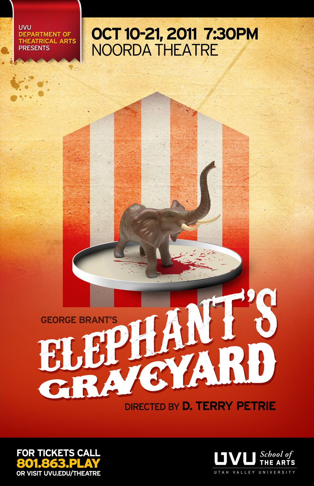 With a darker entry for this theatre season, Elephant's Graveyard portrays the aftermath of the Sparks World Famous Shows circus and the tragedy on September 11, 1916 in Erwin, Tennessee that led to the hanging execution of the circus' main attraction, an African elephant named Mary. The poster design was simple, with abstract and simplified circus elements and the logo incorporated circus-styled fonts.