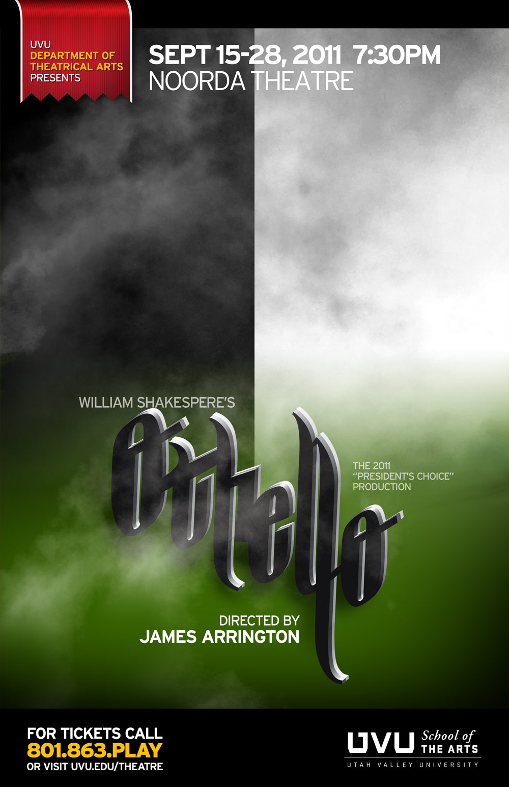 For the Othello poster, the concept was intensionally simple, playing off the black and white motifs from the play. The logo design was created with a black side and a white side to continue the same design ideas. To keep an aire of the military aspect of the play, the use of an "army" type green was incorporated as well.
